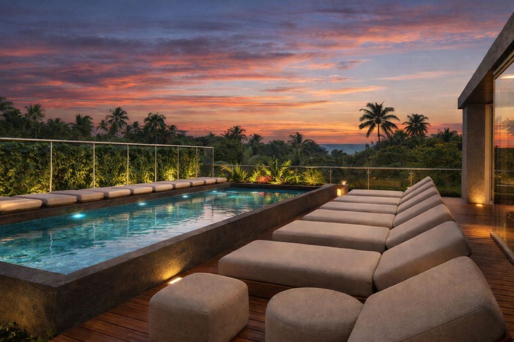 El proyecto es en esquina por lo que se goza de una vista de más de 270°, y en una de sus esquinas es posible observar el horizonte del mar. Una jardinera rodea todo el perímetro, se cuenta con una alberca, un jacuzzi, asoleadero, gimnasio y lounge.